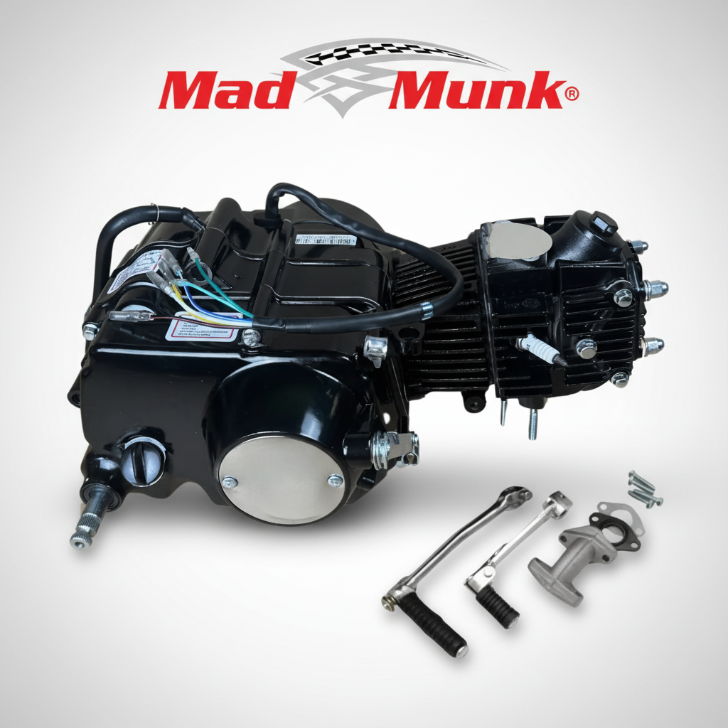 ✔ Embrayage manuel ✔ 4 vitesses (schéma de changement: 1-N-2-3-4) ✔ Système d'allumage CDI 12V ✔ Démarrage par kick uniquement (pas de démarreur électrique)✔ Version robuste noire