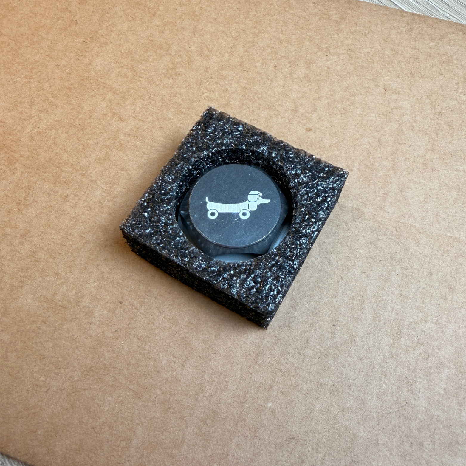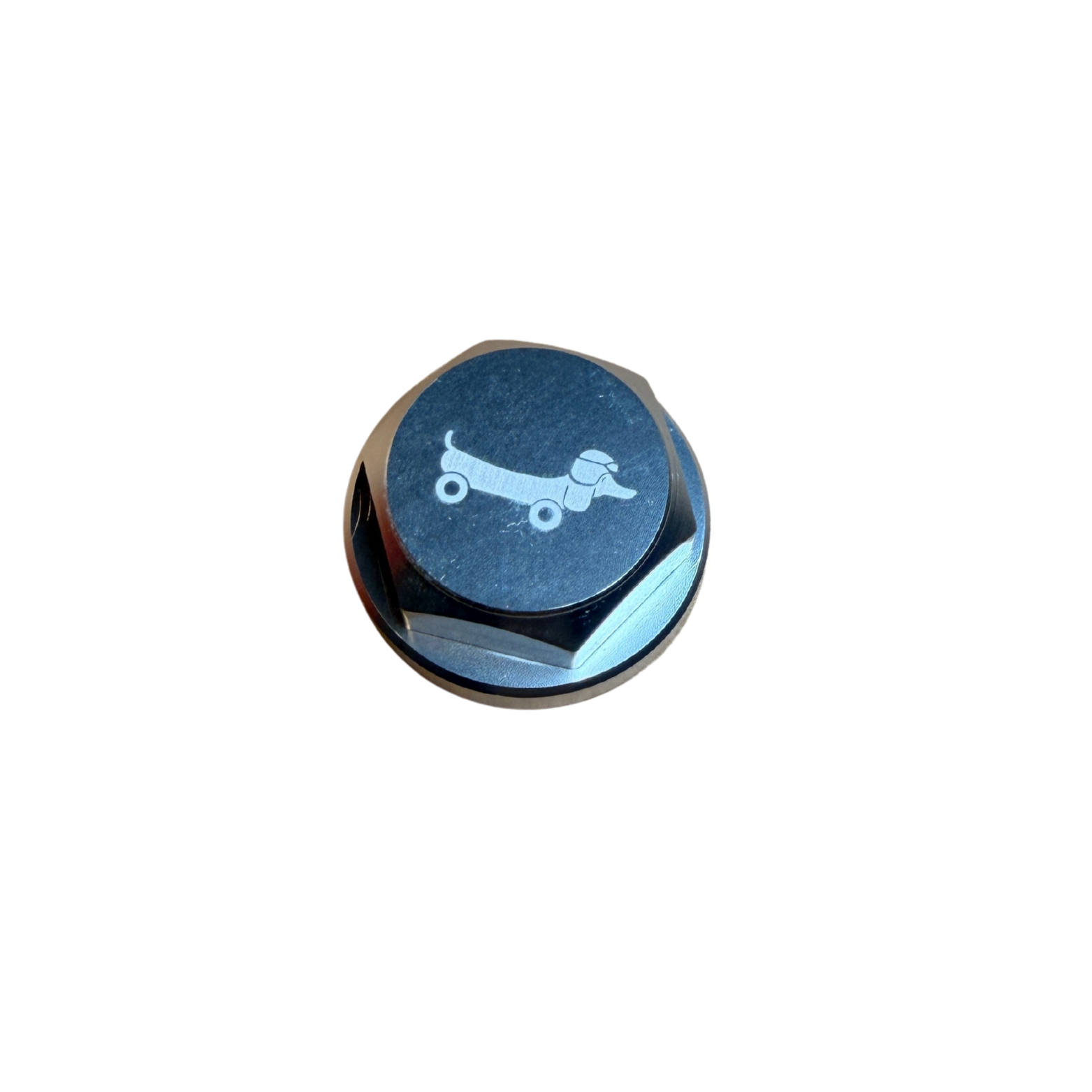 Écrou de direction en aluminium usiné CNC, en remplacement de l'écrou de direction chromé standard. Doté d'un logo laser gravé Never Give Up avec un chien basset sur le dessus.